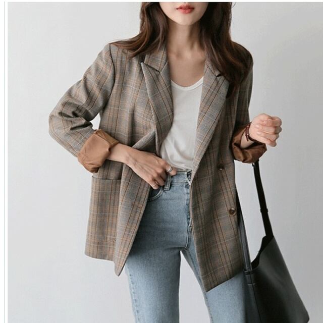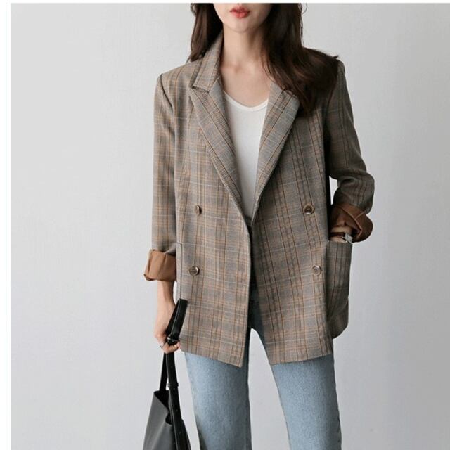 春ジャケットレディース テーラードジャケット スーツコート レディース 春コート グレンチェック 4つボタンフォーマルアウター 無地 七