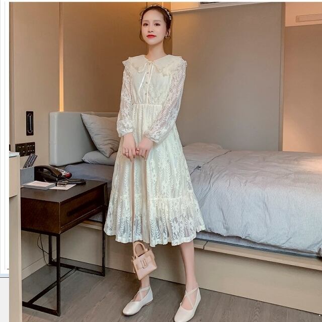 夏物ワンピース オススメのお品 レース生地 オフショル ワンピース ハイウエスト 半袖 フリル 透け感 ひざ下丈