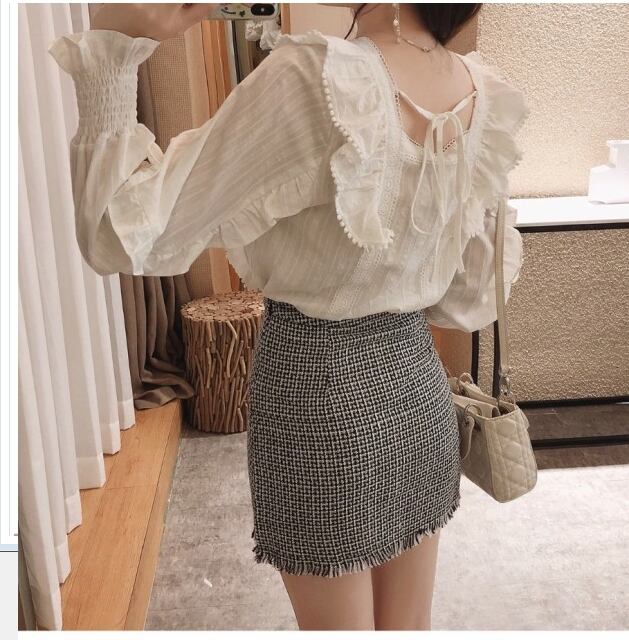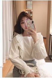フリルブラウス 韓国 チュール 花 フラワー ハイネック フリル 長袖ブラウス 韓国 オルチャン 袖コンシャス 原宿系 ガーリー 透け シース
