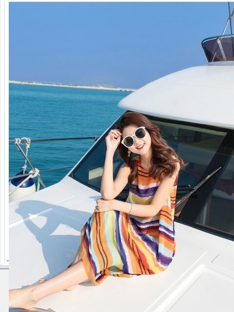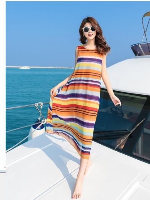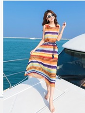 サマー ドレス リゾート サマードレス ノースリーブ ボーダー ボヘミアン ウエストバンド ラウンドネック ビーチドレス ビーチワンピース