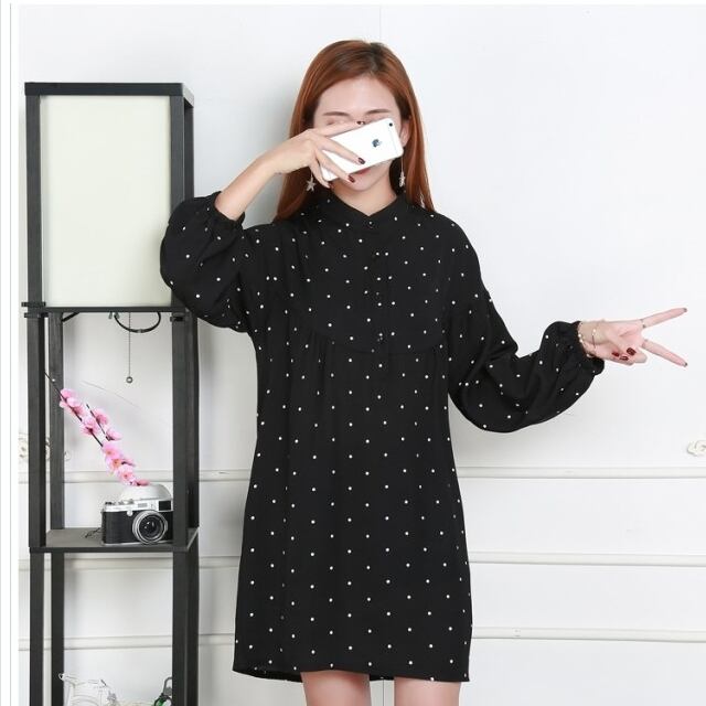 大人可愛い チュニック ワンピース 春のワンピース 春 レディース ワンピース シャツワンピース ドット柄 長袖 チュニック丈 ブラック 大