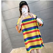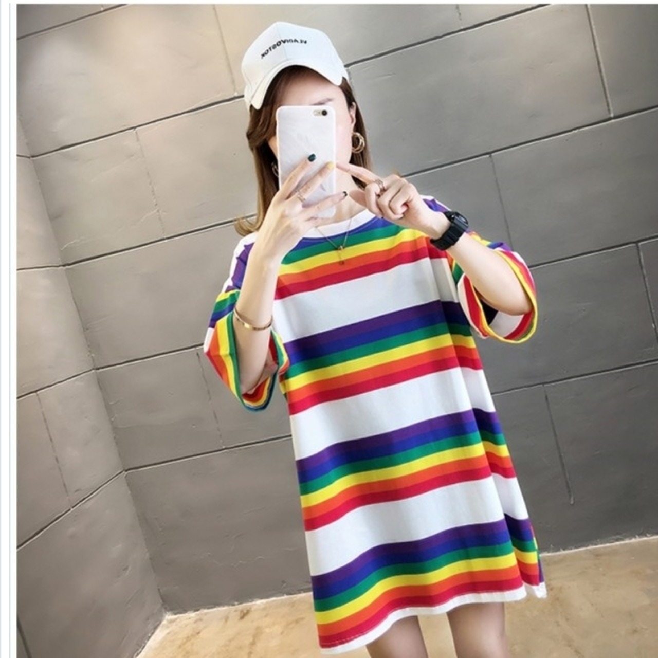 大人可愛い チュニック ワンピース ボーダーワンピースミニワンピースミニ丈半袖レディース春夏ボーダー柄カラフルレインボーカラークル