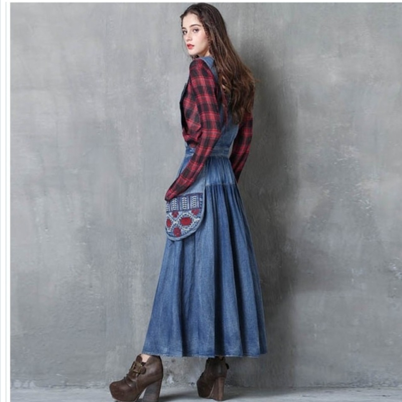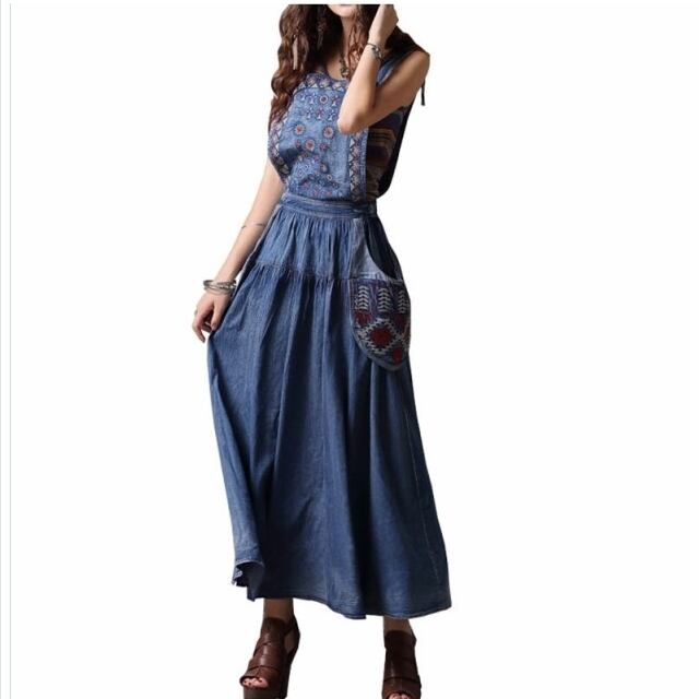 大人可愛い チュニック ワンピース デニムワンピース デニム ワンピース オリジナルデザイン レトロ調 刺繍