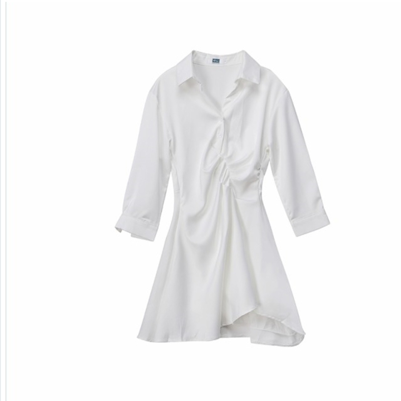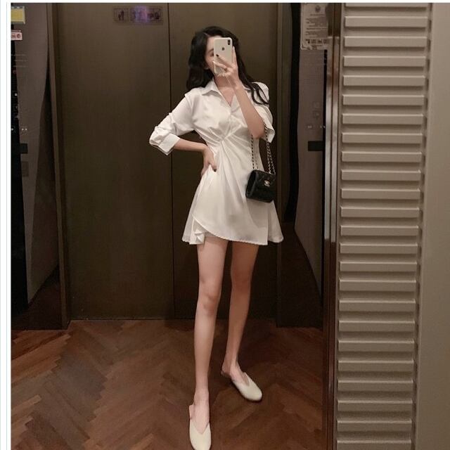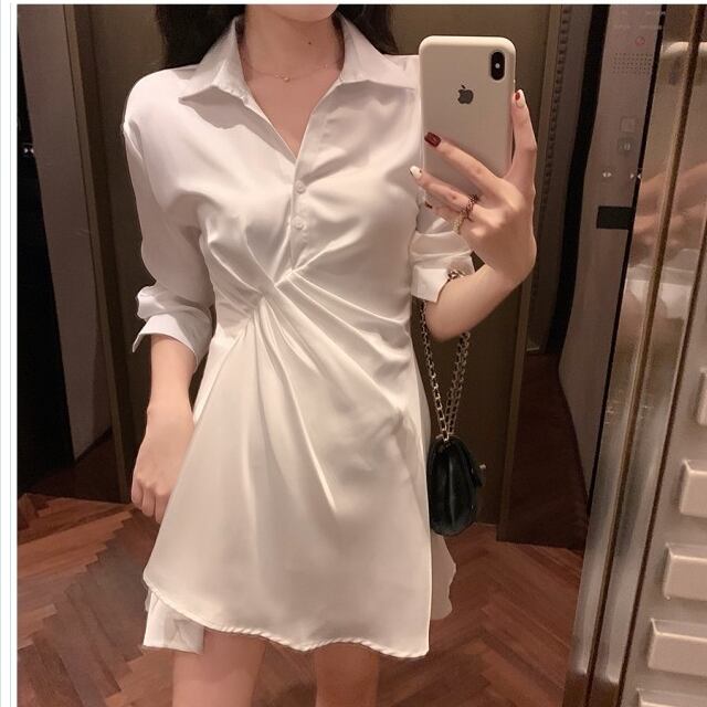 大人 ワンピース タイト 膝丈 シャツワンピース 秋新作 Vネック 長袖 ショート丈 タイトワンピース 白ホワイト カシュクール ワンピ オ