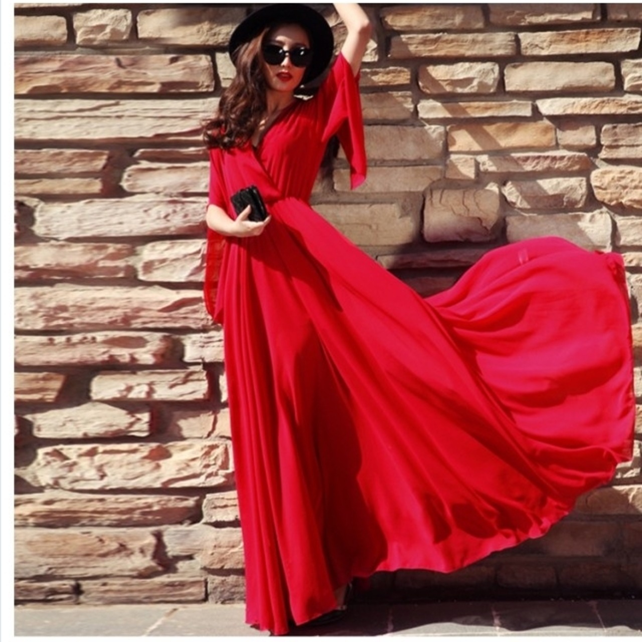 花柄 ロングワンピース 長袖 ワンピース レディース Vネックワンピース シフォンワンピース ボヘミアン ロング 半袖 フレア ハイウエスト