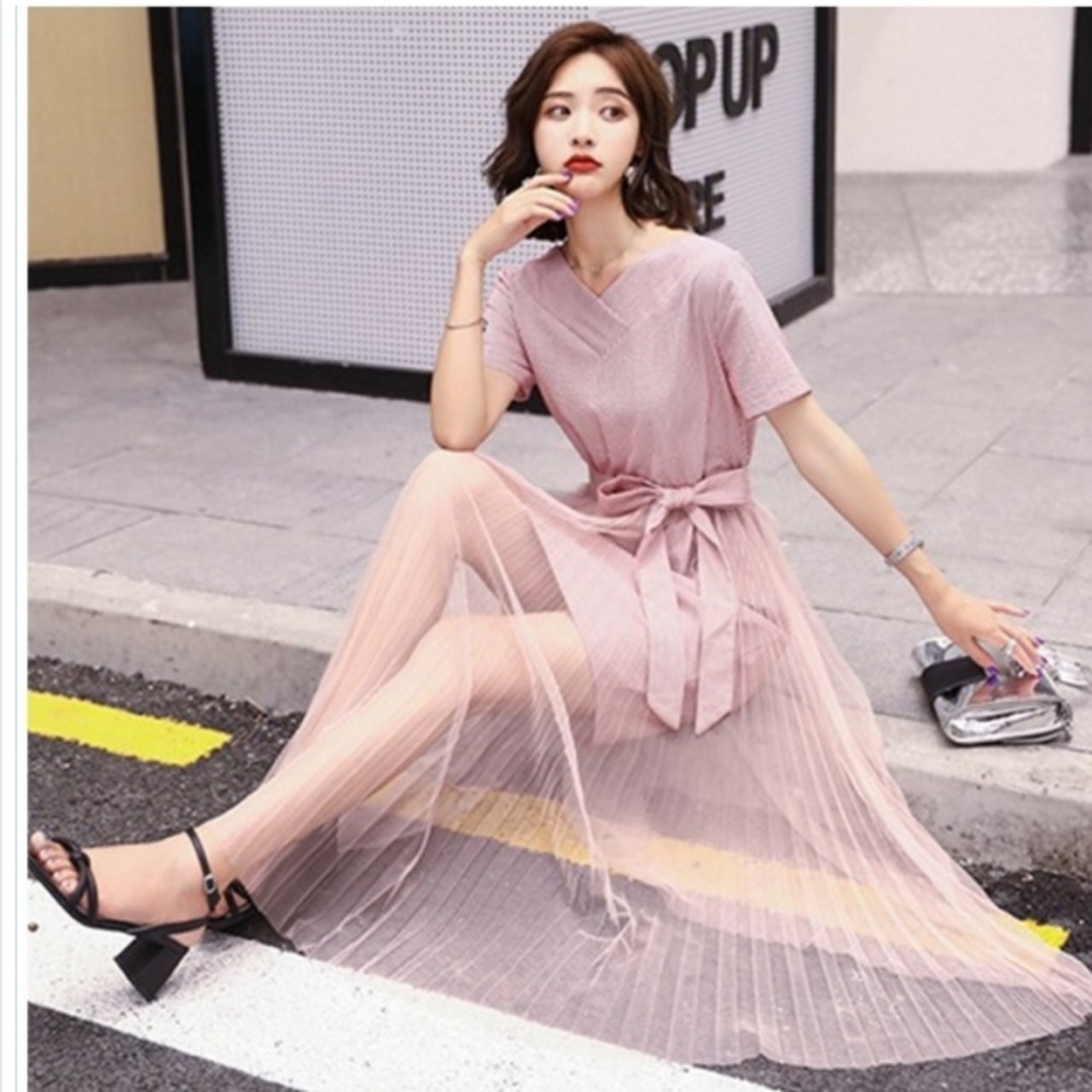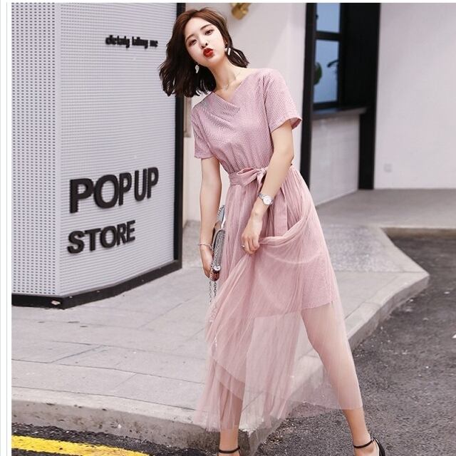 大人可愛い チュニック ワンピース ワンピース フレア 膝上 ミニ パフスリーブ ウエストリボン カシュクール Vネック 半袖 ストライプ柄