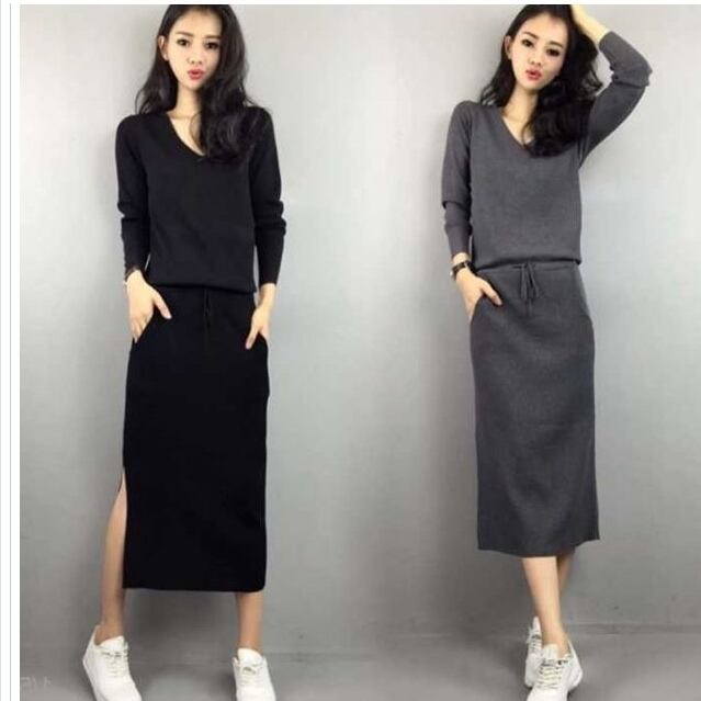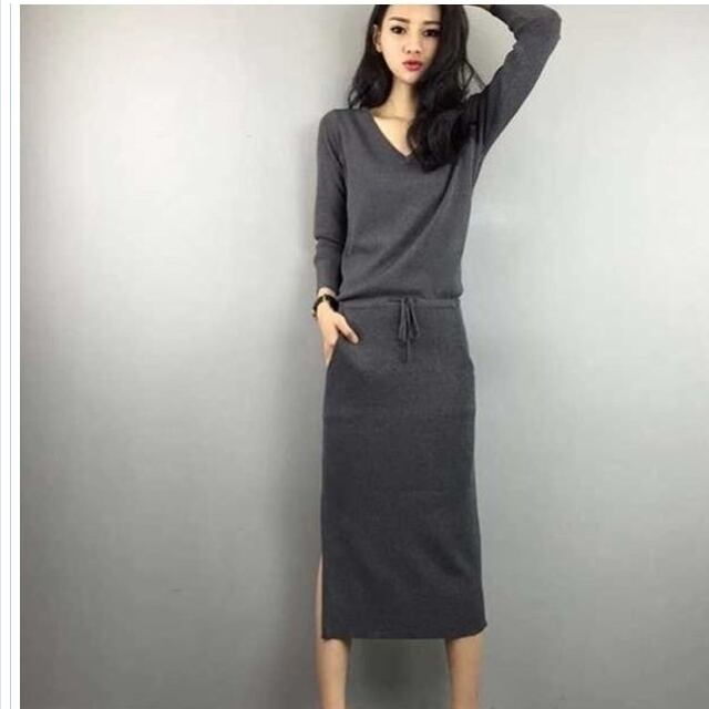 大人可愛い チュニック ワンピース ワンピース セットアップ風 ミディ丈 ミモレ丈 ロング 無地 Vネック 長袖 ブラック グレー 黒 灰色