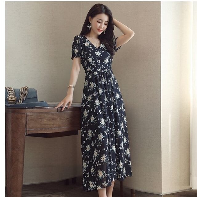 大人可愛い チュニック ワンピース ワンピース ミディ丈 フレア ノースリーブ フラワープリント グリーン エレガント フェミニン シック