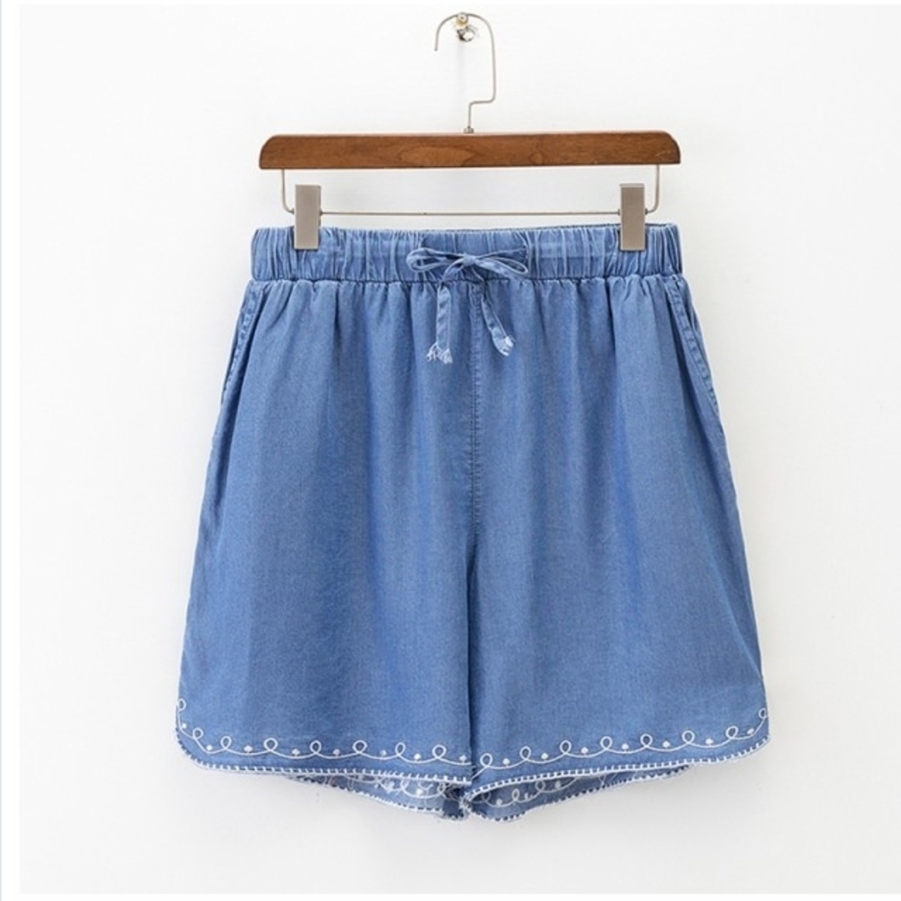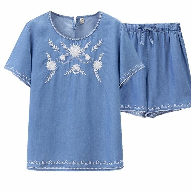 ボートネック ワンピース 胸元の花柄刺繍×透かし模様が女性らしい のインディゴTシャツ。