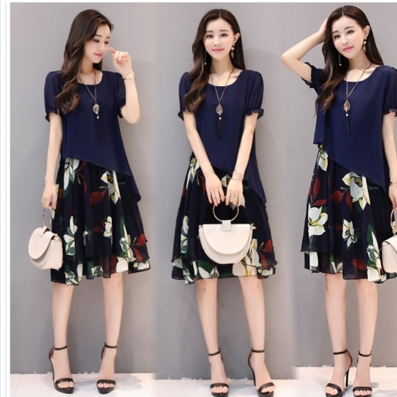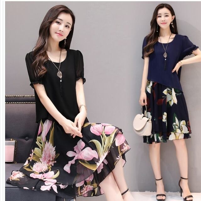 大人可愛い チュニック ワンピース ワンピース ドッキングワンピース 膝丈 花柄 孔雀 丸首 半袖 パフスリーブ フレア 体型カバー 春