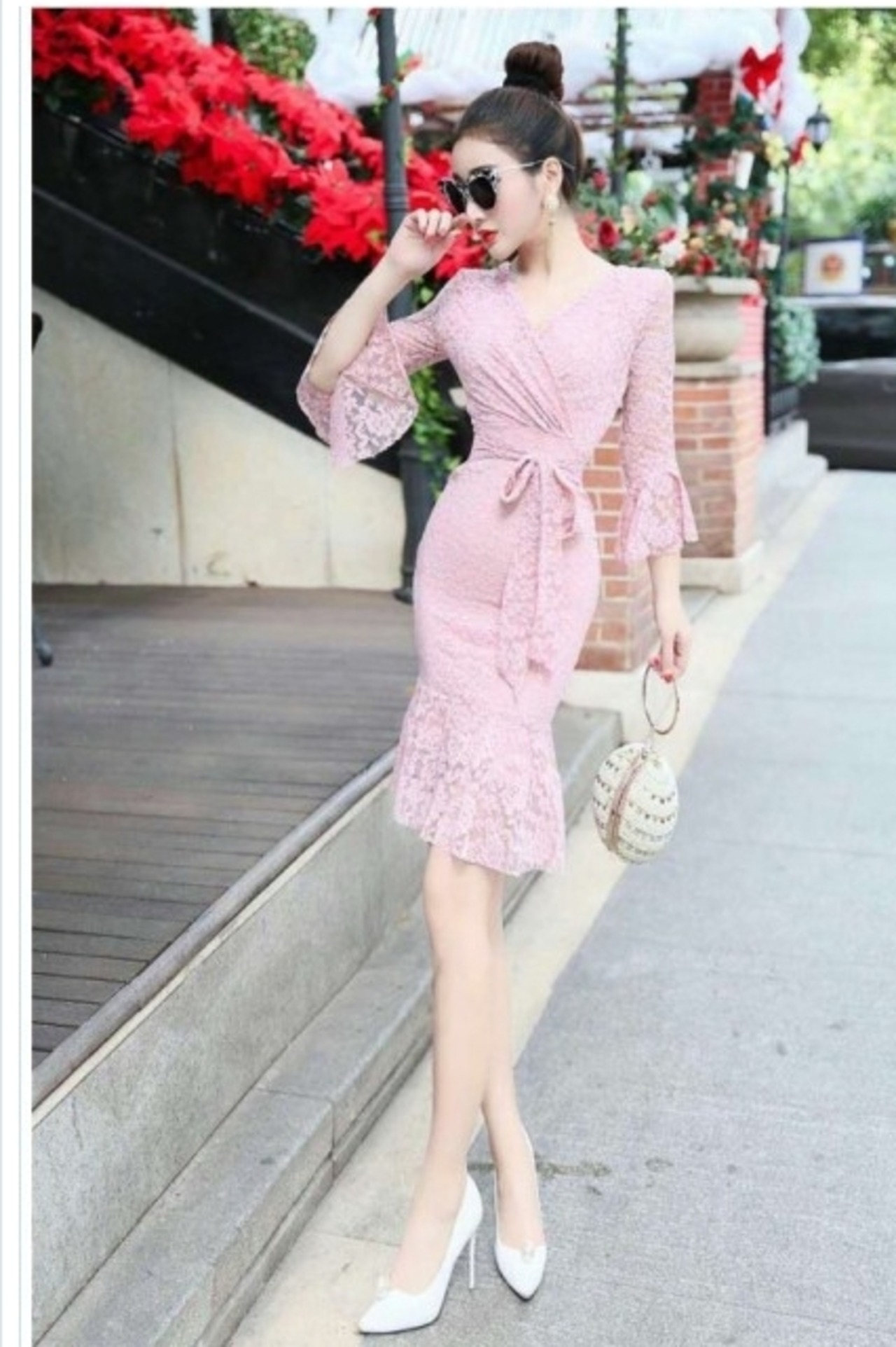 大人 ワンピース タイト 膝丈 レース カシュクール ひざ丈 ワンピース ドレス Vネック 長袖 セクシー タイト ハイウエスト パーティー お