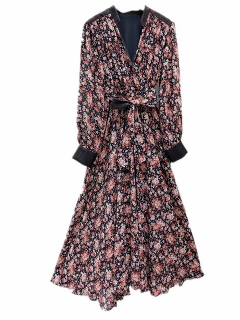 花柄 ロングワンピース 長袖 レディース ワンピース Vネック 花柄 長袖 サッシュベルトフレアスカート カジュアル キュート オレンジ S M