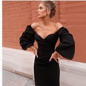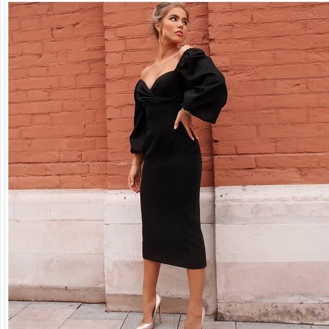 大人 ワンピース タイト 膝丈 レディース バルーン袖 ワンピース ドレス Iライン Vネック ひざ丈 タイト スリム セクシー エレガント パ