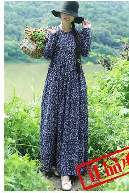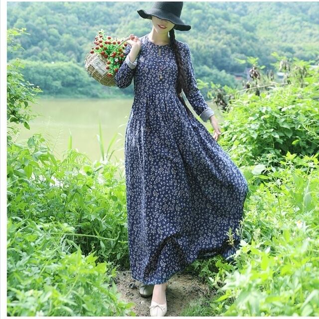 花柄 ロングワンピース 長袖 ワンピース ロングワンピース ロング丈 体型カバー ハイウエスト 長袖 丸首 ゆったり 花柄 春秋