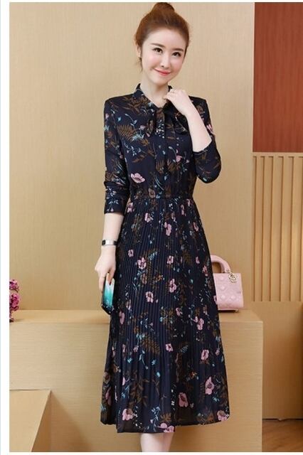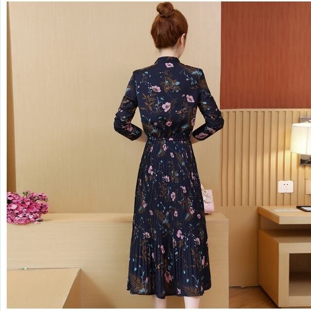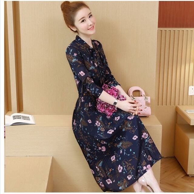 花柄 ロングワンピース 長袖 ワンピース ロングワンピース ロング丈 Aライン 長袖 春秋 リボンタイ 花柄 フレア マキシ丈