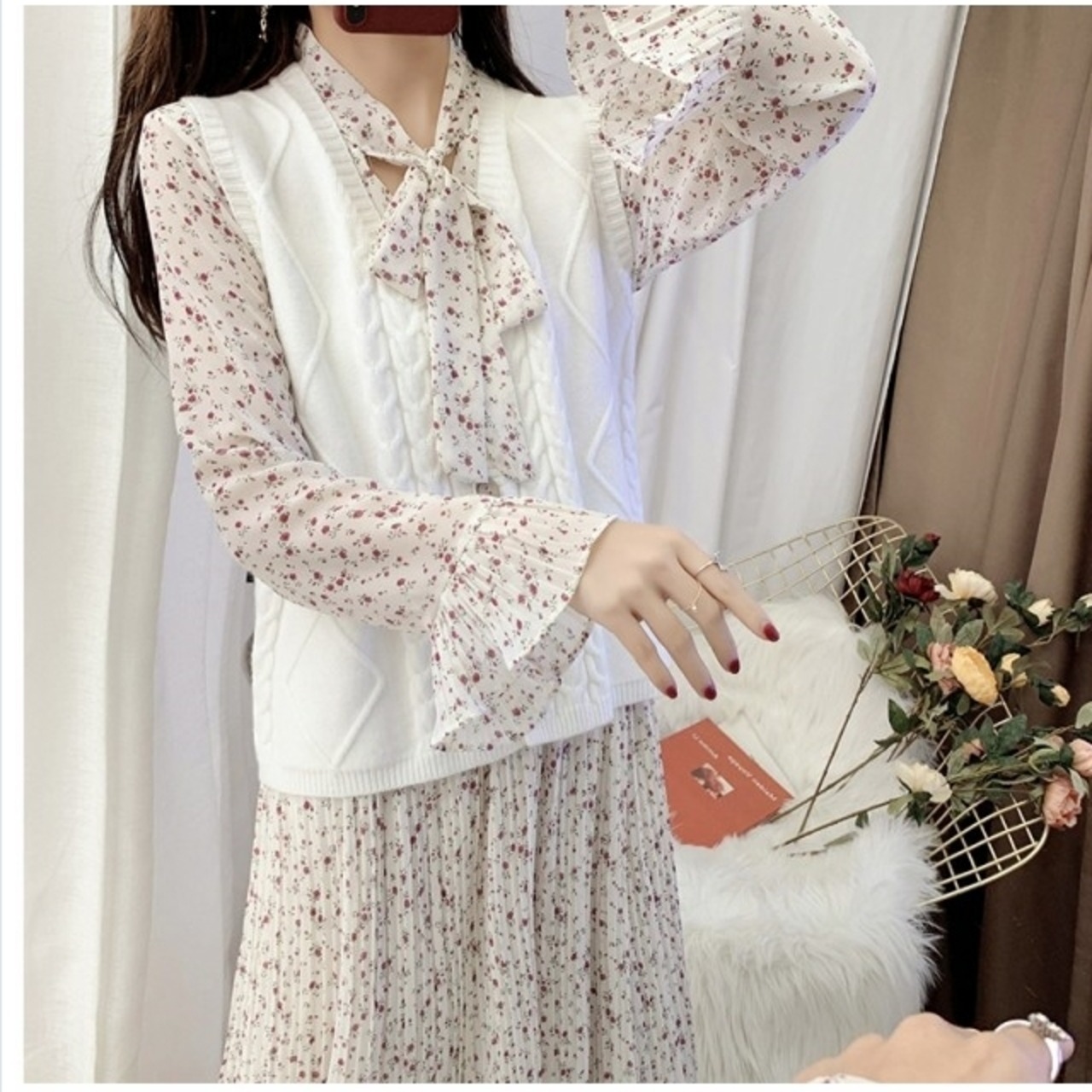 花柄 ロングワンピース 長袖 ワンピース レディース ロング丈ワンピース 花柄ワンピース リボン 長袖 シフォン ベルスリーブ フリル