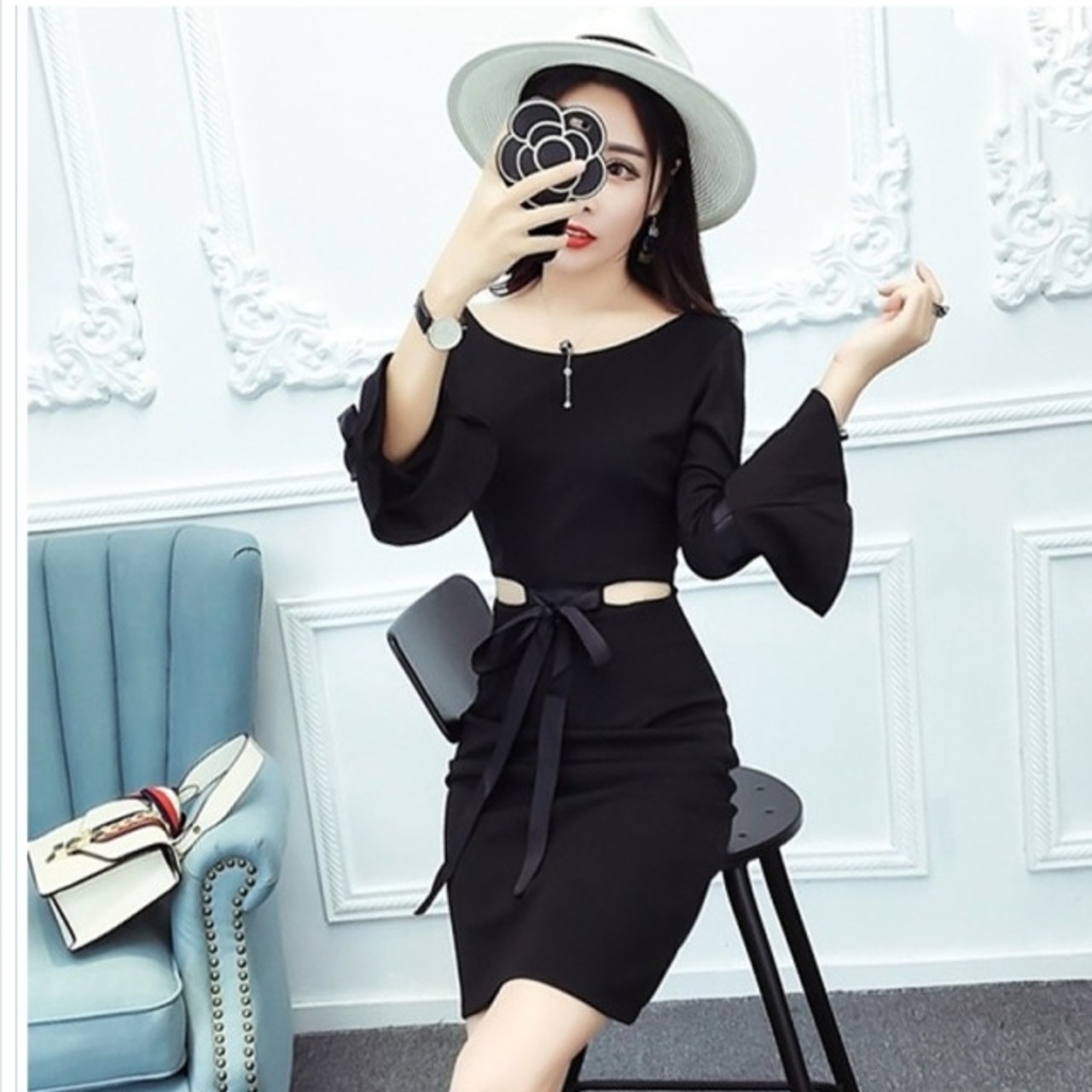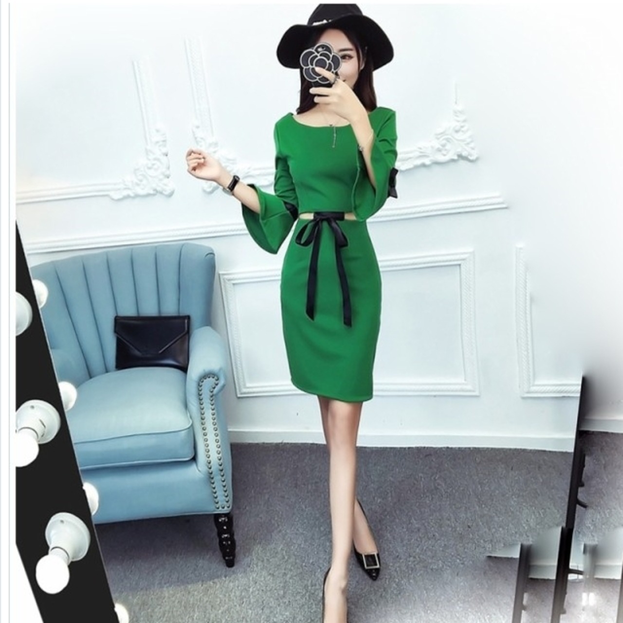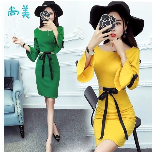 大人 ワンピース タイト 膝丈 ワンピース 長袖 ひざ丈 ラウンドネック ベルスリーブ ハイウエスト ウエスト見せ タイト スリット