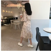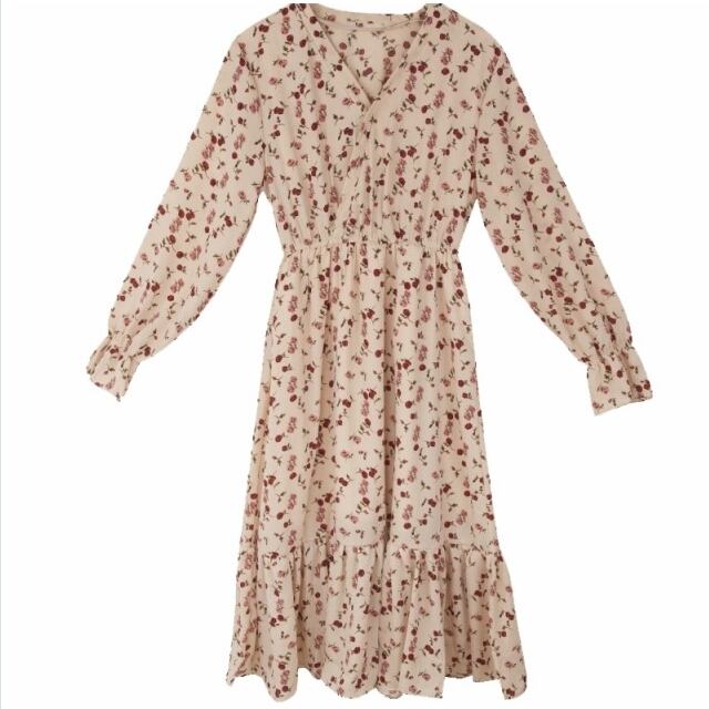 花柄 ロングワンピース 長袖 ワンピース 膝丈 長袖 フレアワンピース ひざ下丈 ロング丈 Vネック ウエストリボン ギャザー フリル 切り替