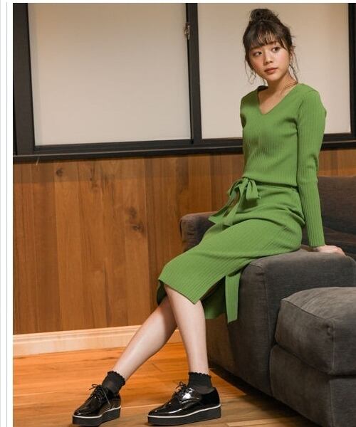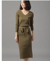 大人 ワンピース タイト 膝丈 ニットワンピース スリット シンプル 無地 長袖 ひざ丈 ウエストリボン リブニット ハイウエスト ラウンド