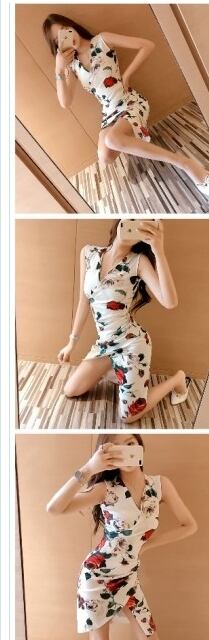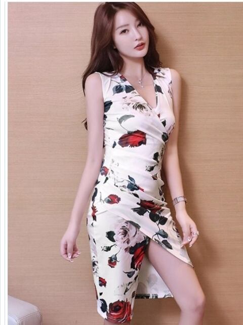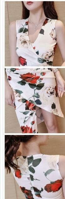 大人 ワンピース タイト 膝丈 レディース ワンピース ノースリーブ Vネック ひざ丈 花柄 タイト スリム ハイウエスト アシンメトリー デ