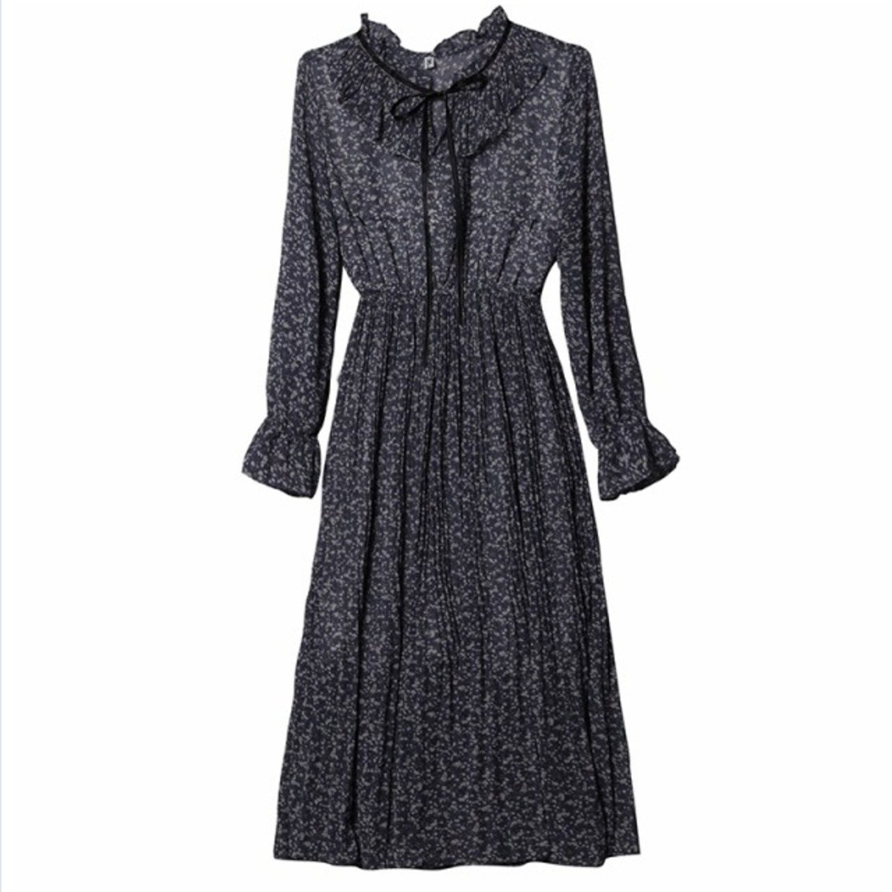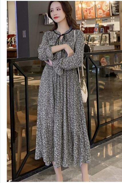 花柄 ロングワンピース 長袖 ワンピース 長袖 シフォン ロング 小花柄 大人可愛い リボン ウエストマーク