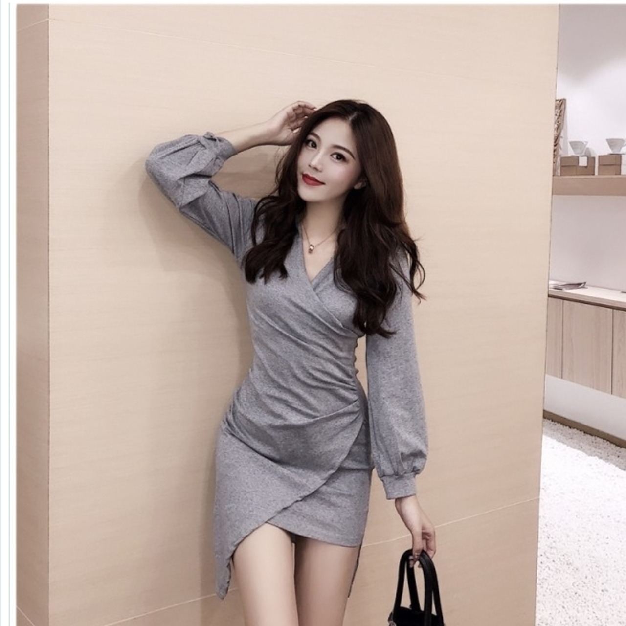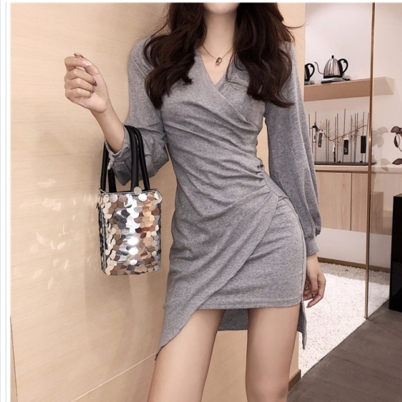 大人 ワンピース タイト 膝丈 パフスリーブ ワンピース タイト ひざ丈 胸元 カシュクール vネック パーティードレス セクシー ボリュー