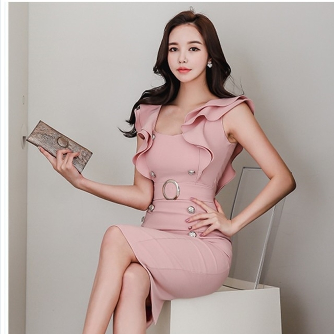 大人 ワンピース タイト 膝丈 レディース ワンピース ドレス ノースリーブ フリル ひざ丈 ミディ丈 タイト スリム デート