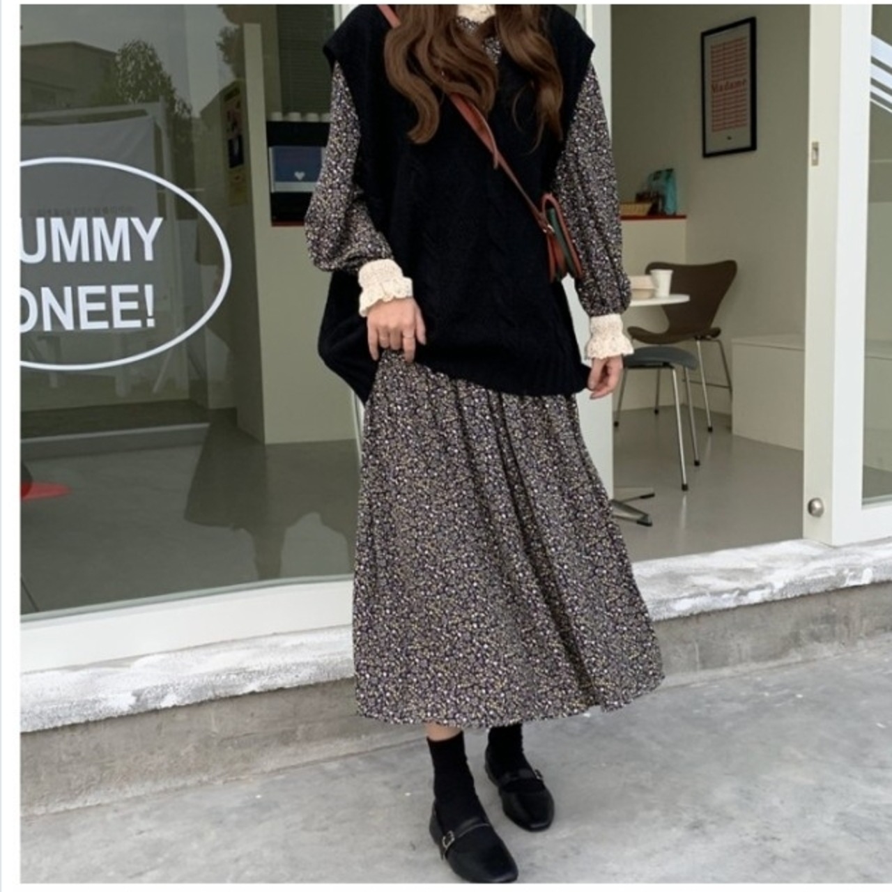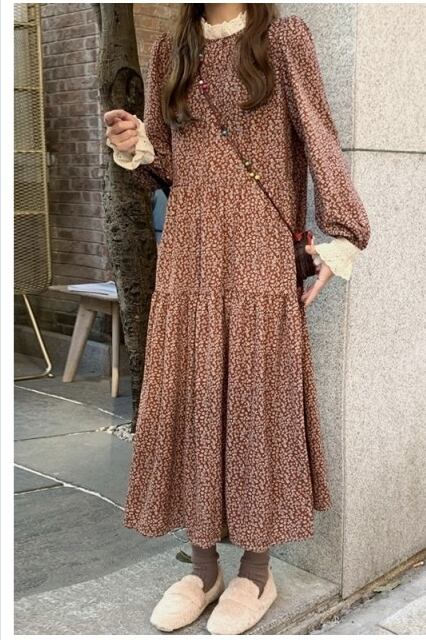 花柄 ロングワンピース 長袖 ミモレワンピース レディース ワンピース ロング丈ワンピース 小花柄 長袖ワンピース フェミニン 優雅 エレ
