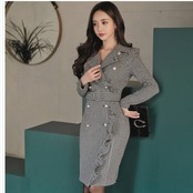 大人 ワンピース タイト 膝丈 レディース ラップワンピース 千鳥格子 チェック ひざ丈 長袖 フリル タイト スリム 大人 カジュアル エレ