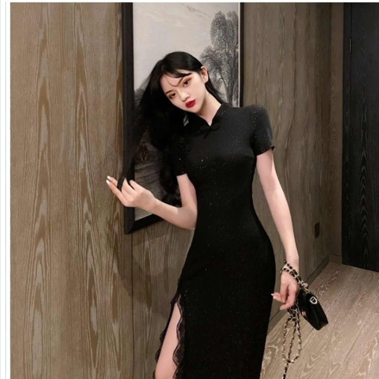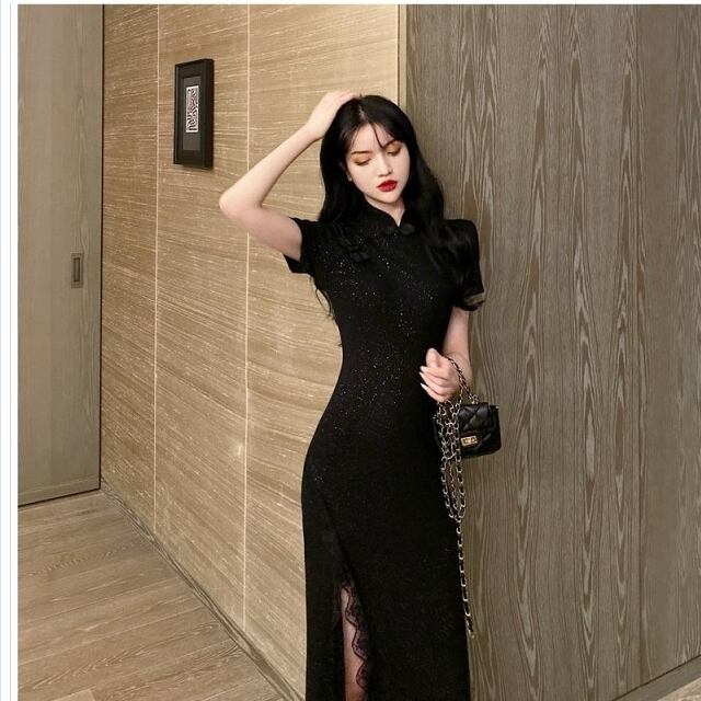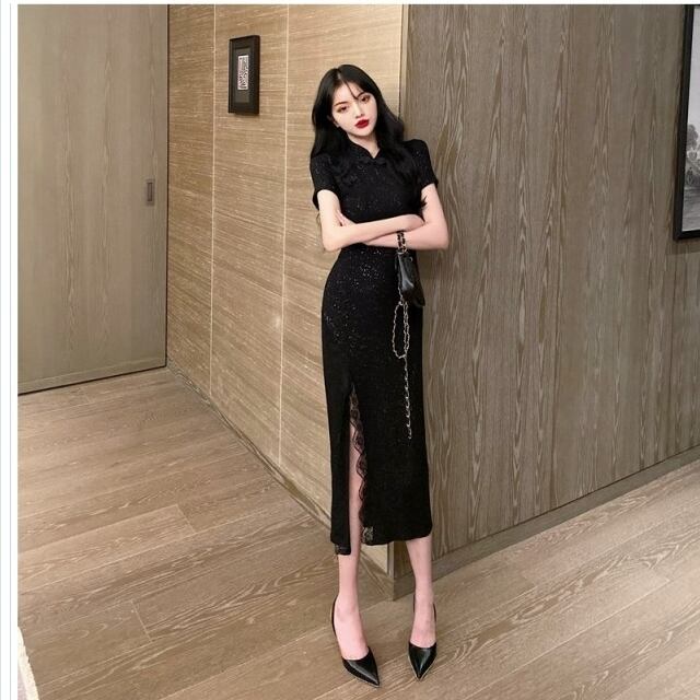 大人 ワンピース タイト 膝丈 韓国 ファッション レディース ワンピース チャイナドレス ひざ丈 スリット レース ラメ エレガント ハイウ