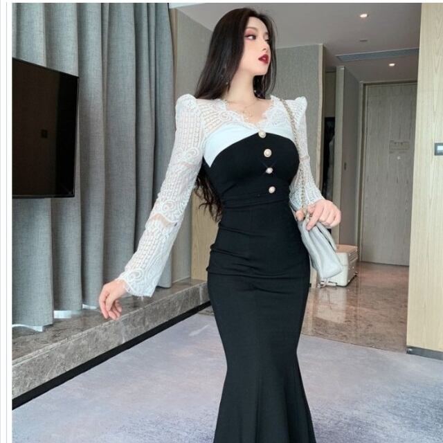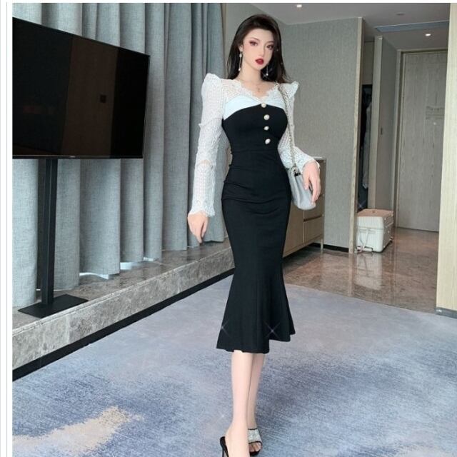 大人 ワンピース タイト 膝丈 黒 マーメイドワンピース 白レース袖 お呼ばれ 二次会 エレガント 春 30代 大人 40代 長袖 膝丈ワンピース