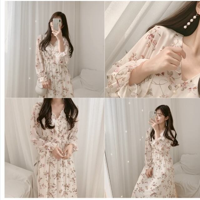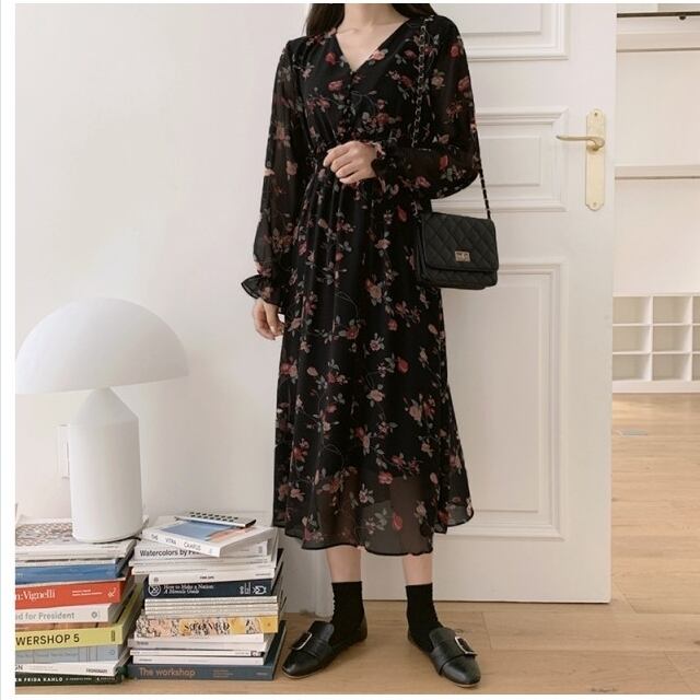 花柄 ロングワンピース 長袖 キレイめワンピース ワンピース Iライン ミモレ丈 ミディ丈 ロング丈 Vネック シフォン 透け感 フレア 春物