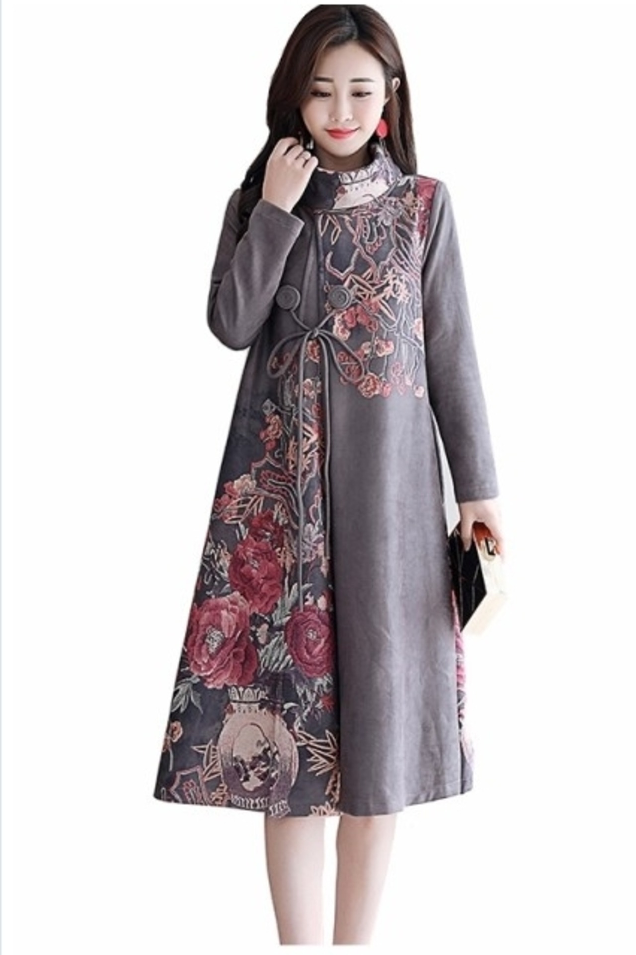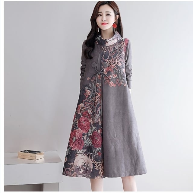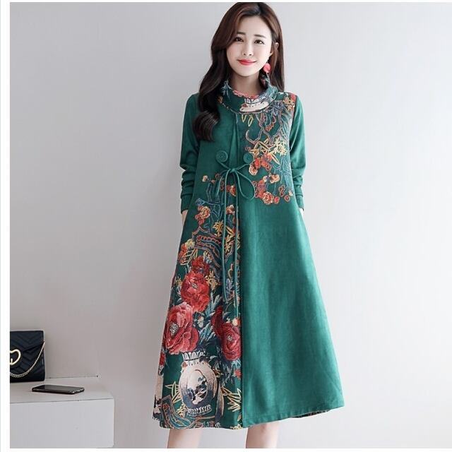 花柄 ロングワンピース 長袖 レディース民族風 長袖 ワンピース チャイナ風 ナチュラル エスニッ チャイナドレス 古代 スリム効果 ロング