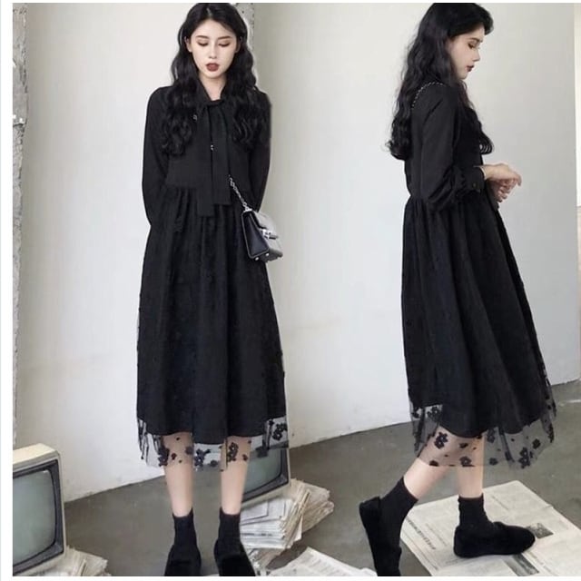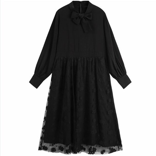花柄 ロングワンピース 長袖 ボウタイ 黒 ワンピース 長袖ワンピース大きいサイズ 3L 4L 5L レディース ミモレ丈 レース 花柄 秋 春 きれ