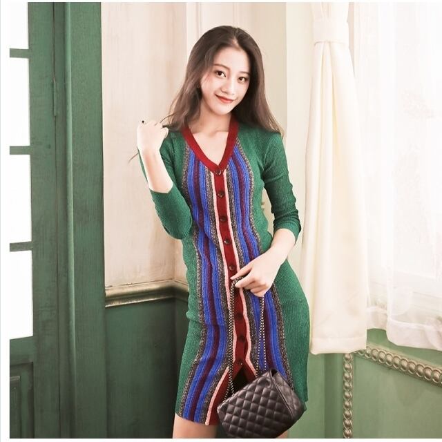 花柄 ロングワンピース 長袖 ワンピース レディース ニットワンピース ロングワンピース Vネック ストライプ 長袖 秋冬