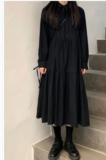 大人可愛い チュニック ワンピース 長袖ワンピースミニワンピフレアリボンボウタイシンプル大人デイリー使いシフォンプリーツ可愛い