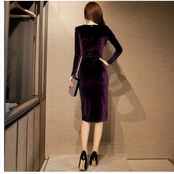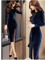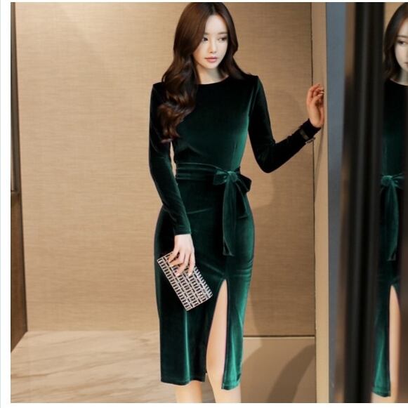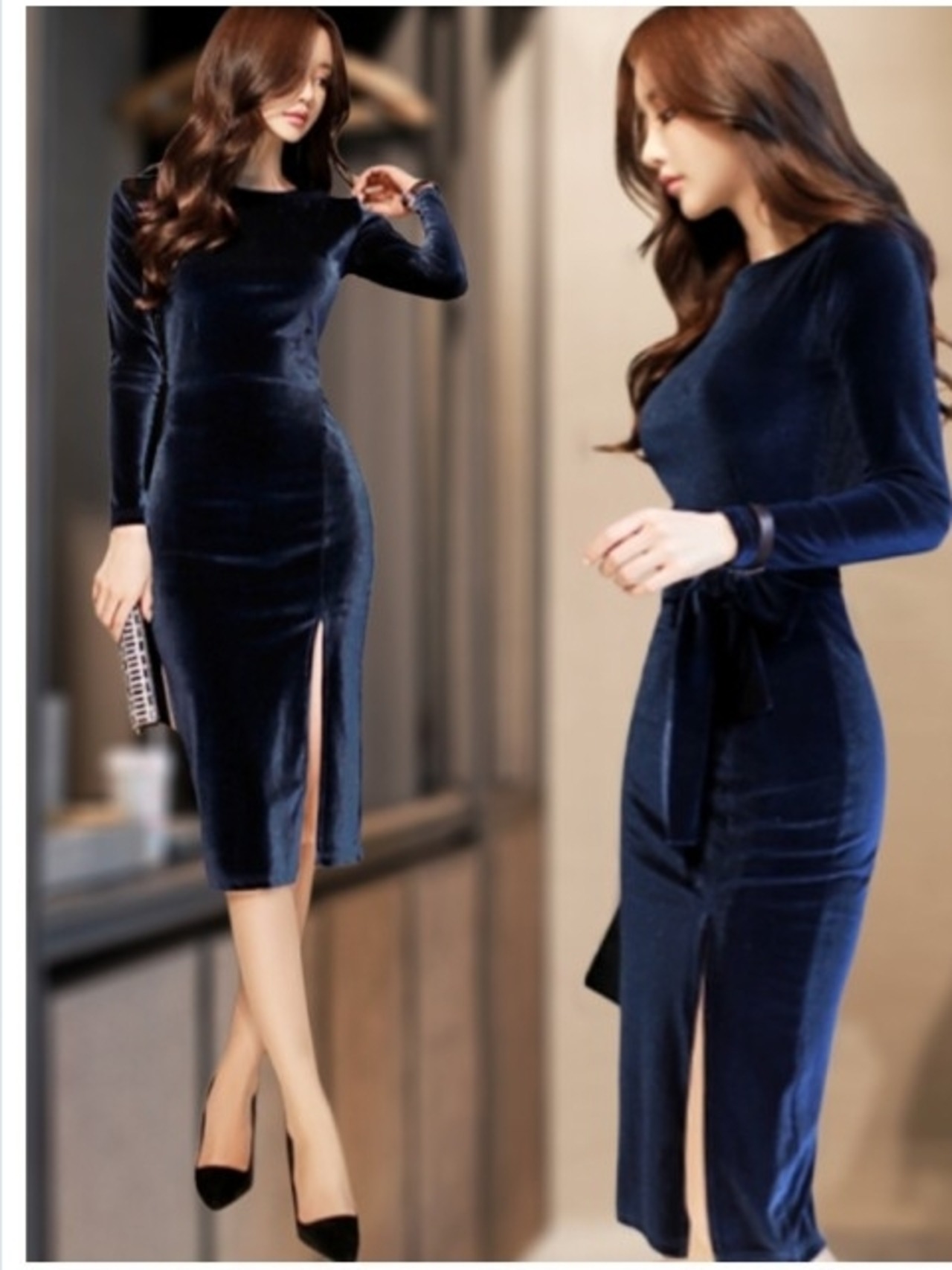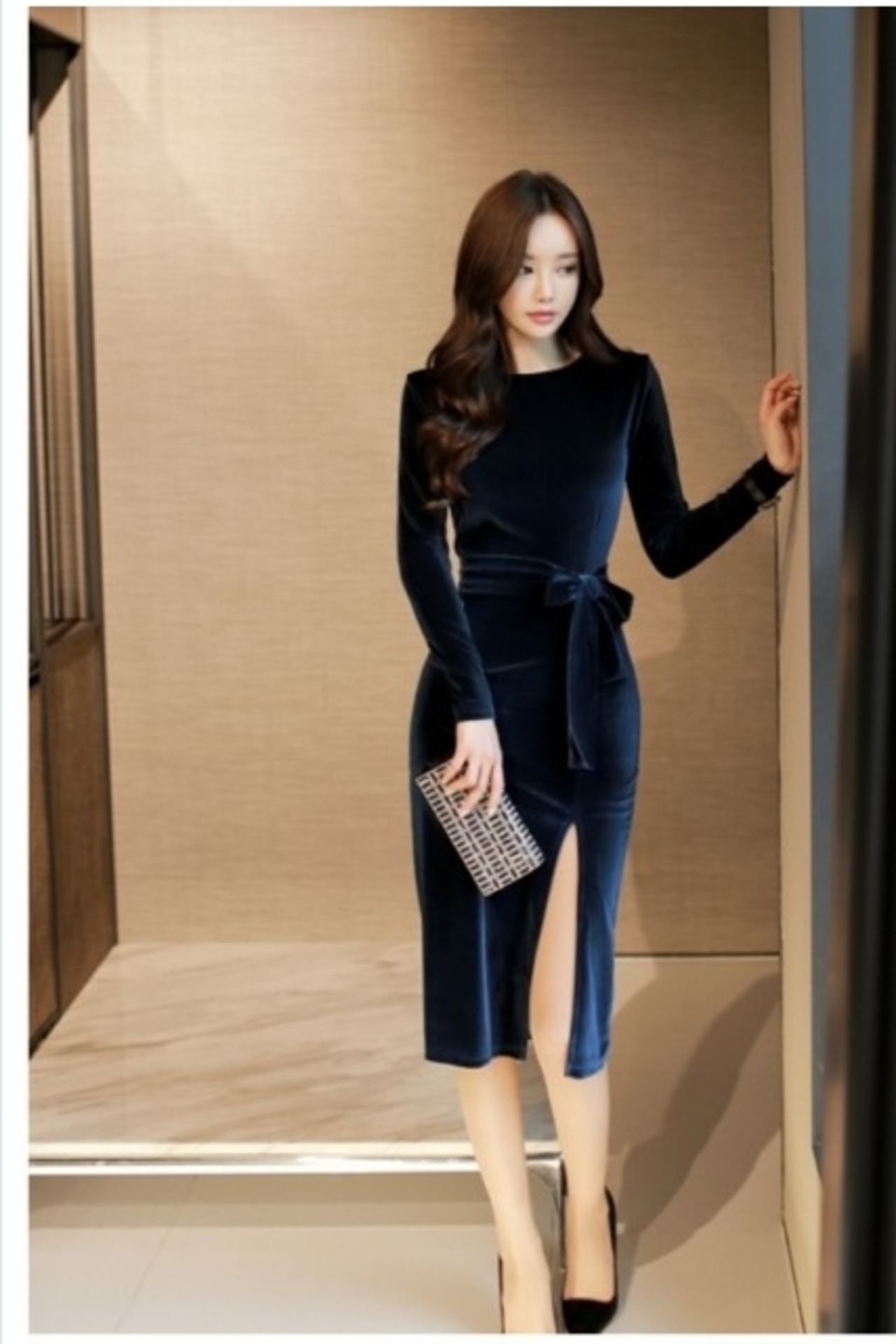 ボートネック ワンピース ワンピース 長袖 ひざ丈 セクシー タイト ウエストリボン スリット レディース 姫系 ボートネック