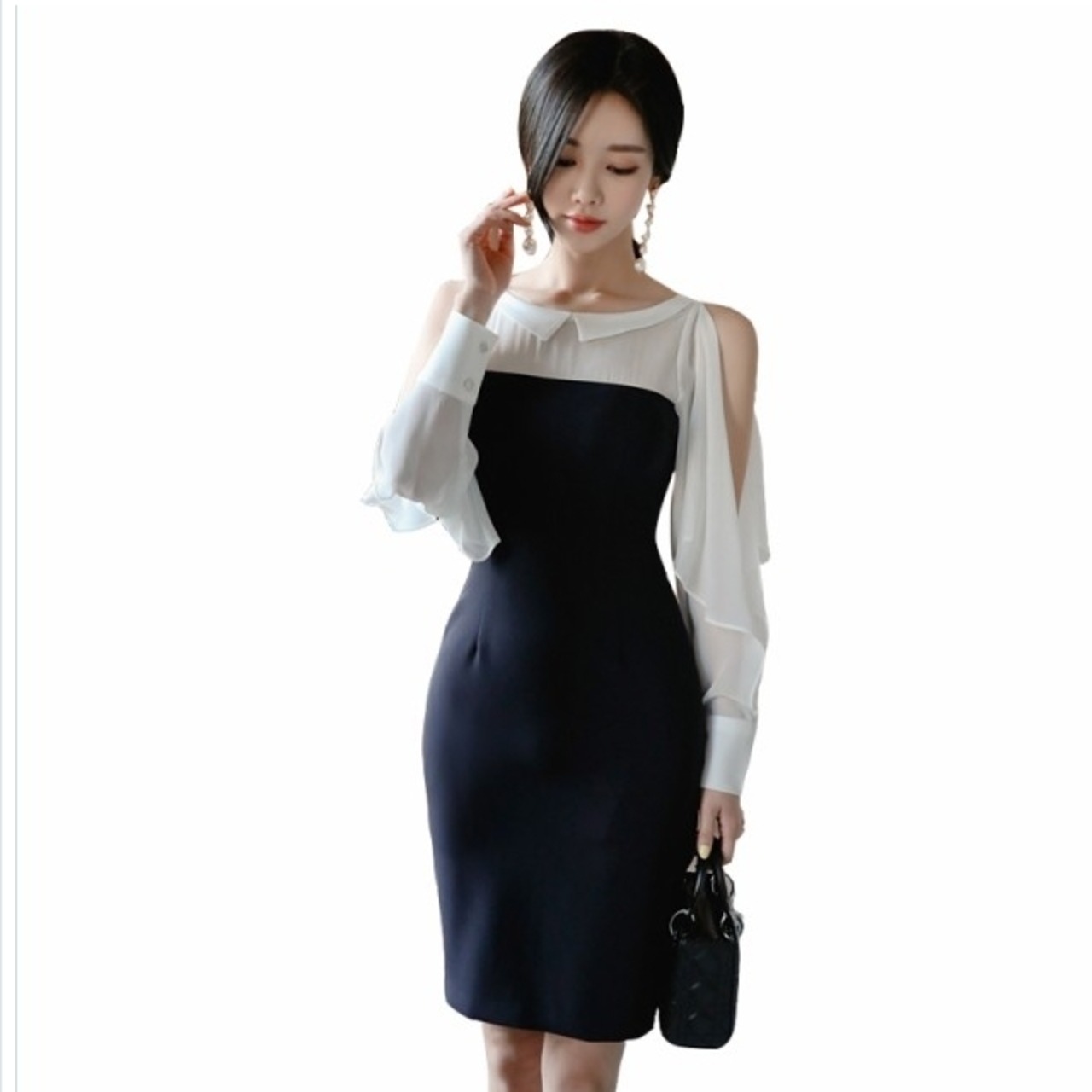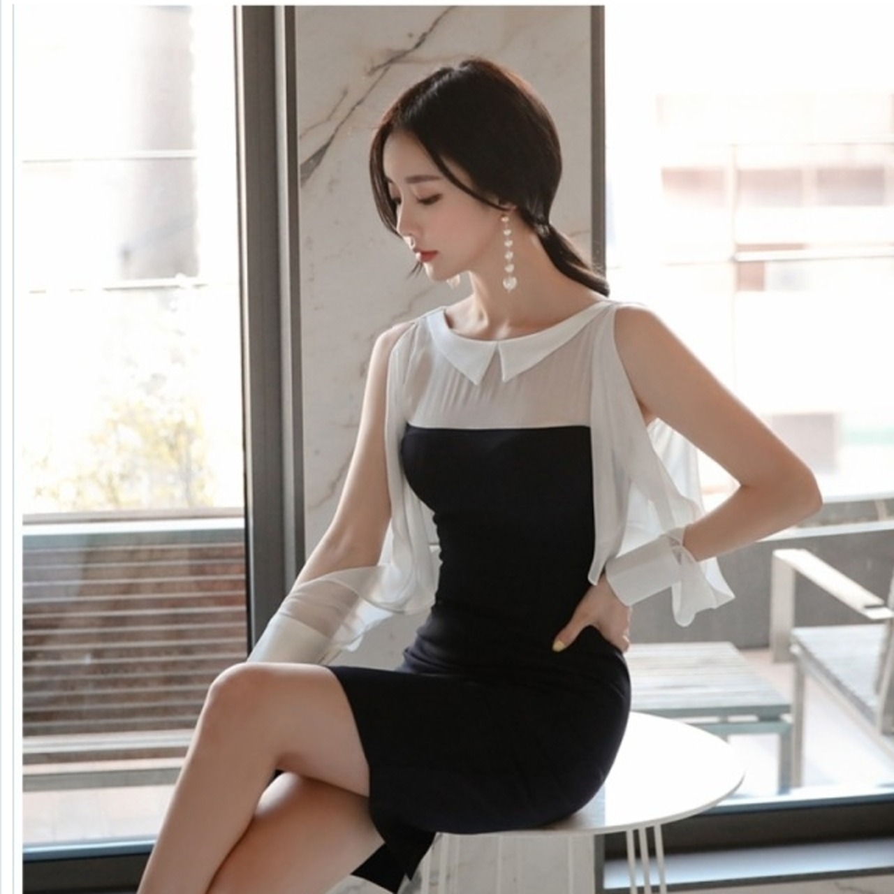 大きいサイズ コーディガン ワンピース タイト ミニ丈 膝上 ドッキングデザイン 細ストライプ柄 無地 ブラック きれいめ 上品 フェミニン
