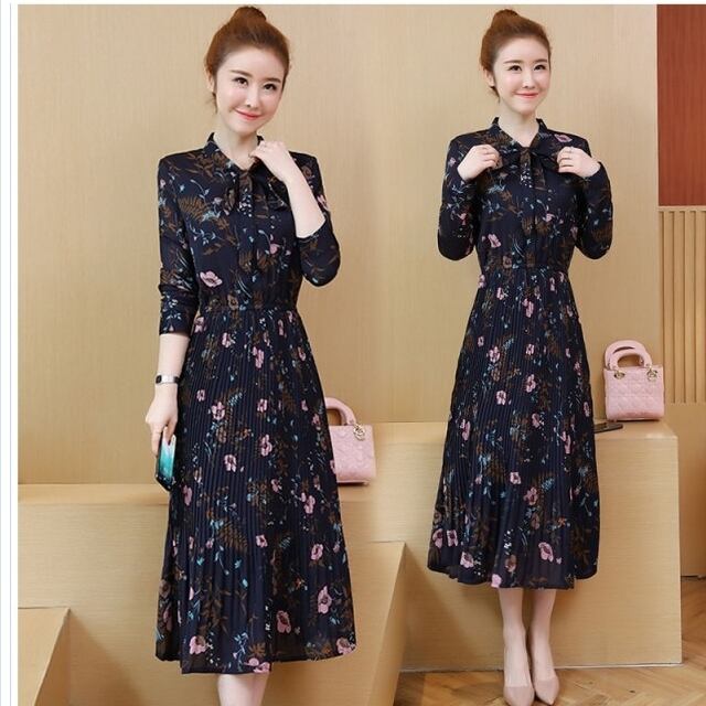 プリーツスカート ロング 花柄 ワンピース レディース 長袖ワンピース プリーツワンピース ロング 花柄 プリーツスカート フロントリボン