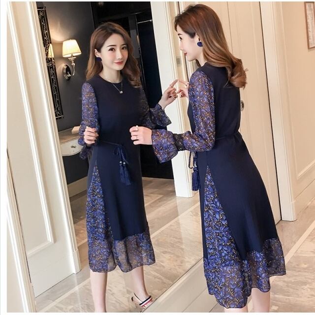 ボートネック ワンピース ニットワンピース ロング 秋 冬 タイト 花柄ワンピース ボートネック 長袖 リブニット シフォン チュール フレ