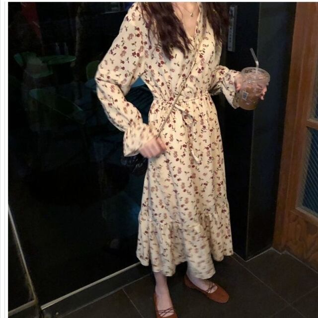 プリーツスカート ロング 花柄 花柄 ロングワンピース カシュクール 長袖 プリーツ デート服 ゆったり 体型カバー 春服 秋服 春ワンピー
