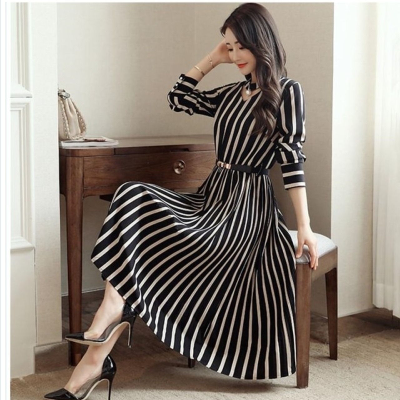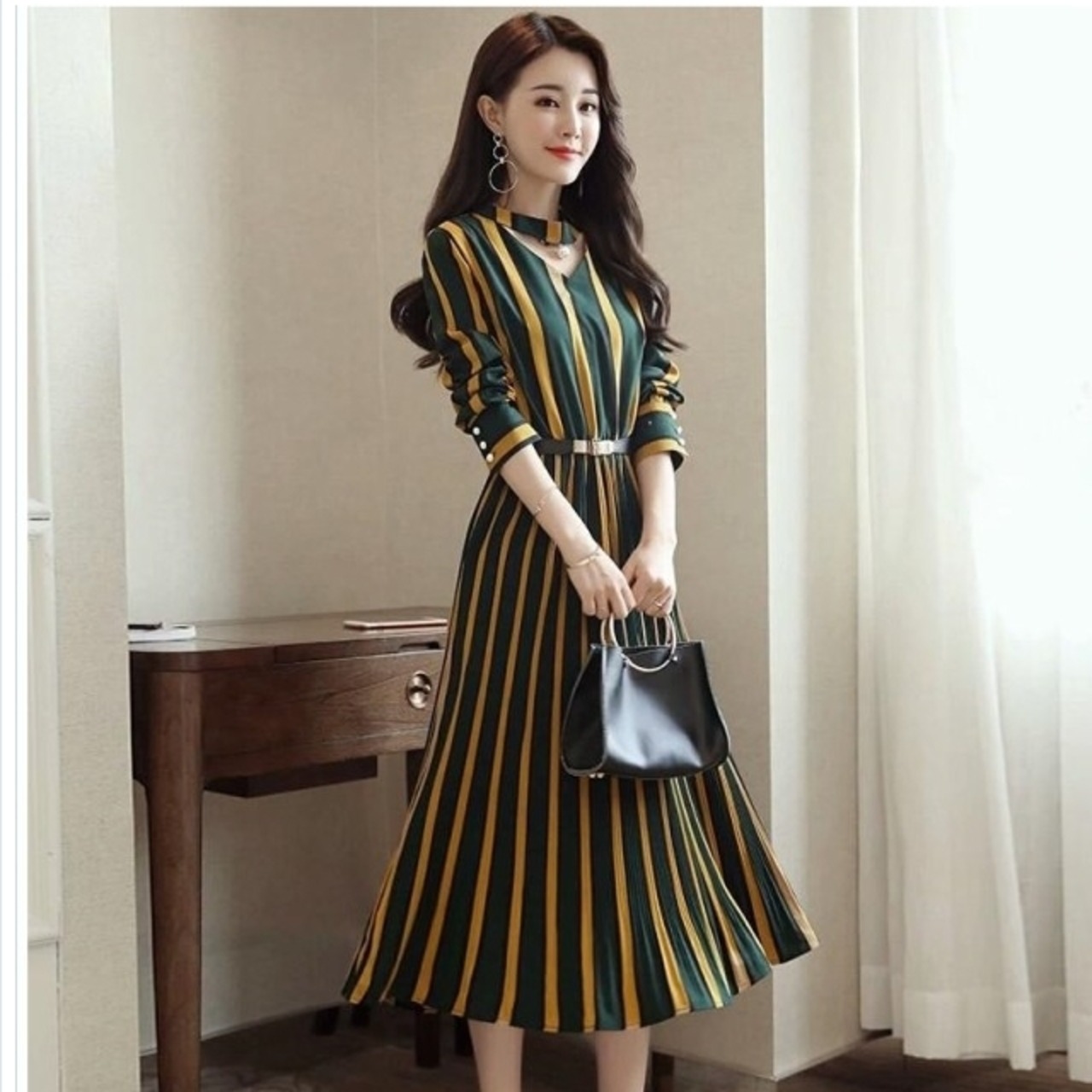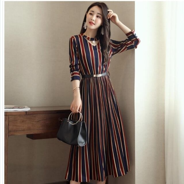 プリーツスカート ロング 花柄 韓国 ワンピース ミモレ丈 長袖 スカート きれいめ 上品 ストライプ 結婚式 二次会 秋冬 発表会 20代 30代