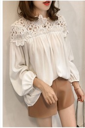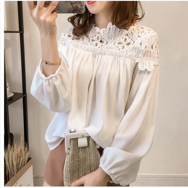 シアー トップス カットワークレース切り替え シアースルー パフスリーブ ブラウス レディース春夏