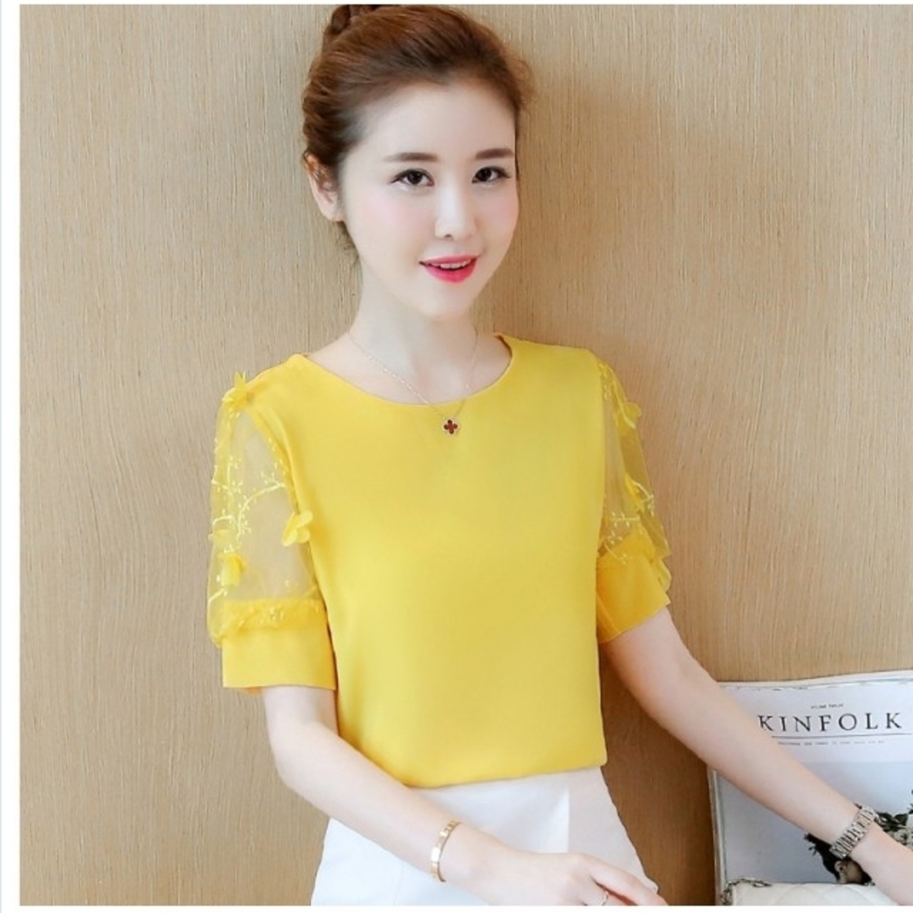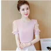 シアー トップス トップス ブラウス シフォンブラウス チュール袖 花柄 パフスリーブ レース シースルー 透け感 シアー 丸首 ラウンドネ