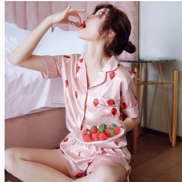 ルームウェア レディース 大きいサイズ 前開き ルームウェア パジャマ 2点セット いちご柄 レディース 部屋着 おしゃれ かわいい 可愛い