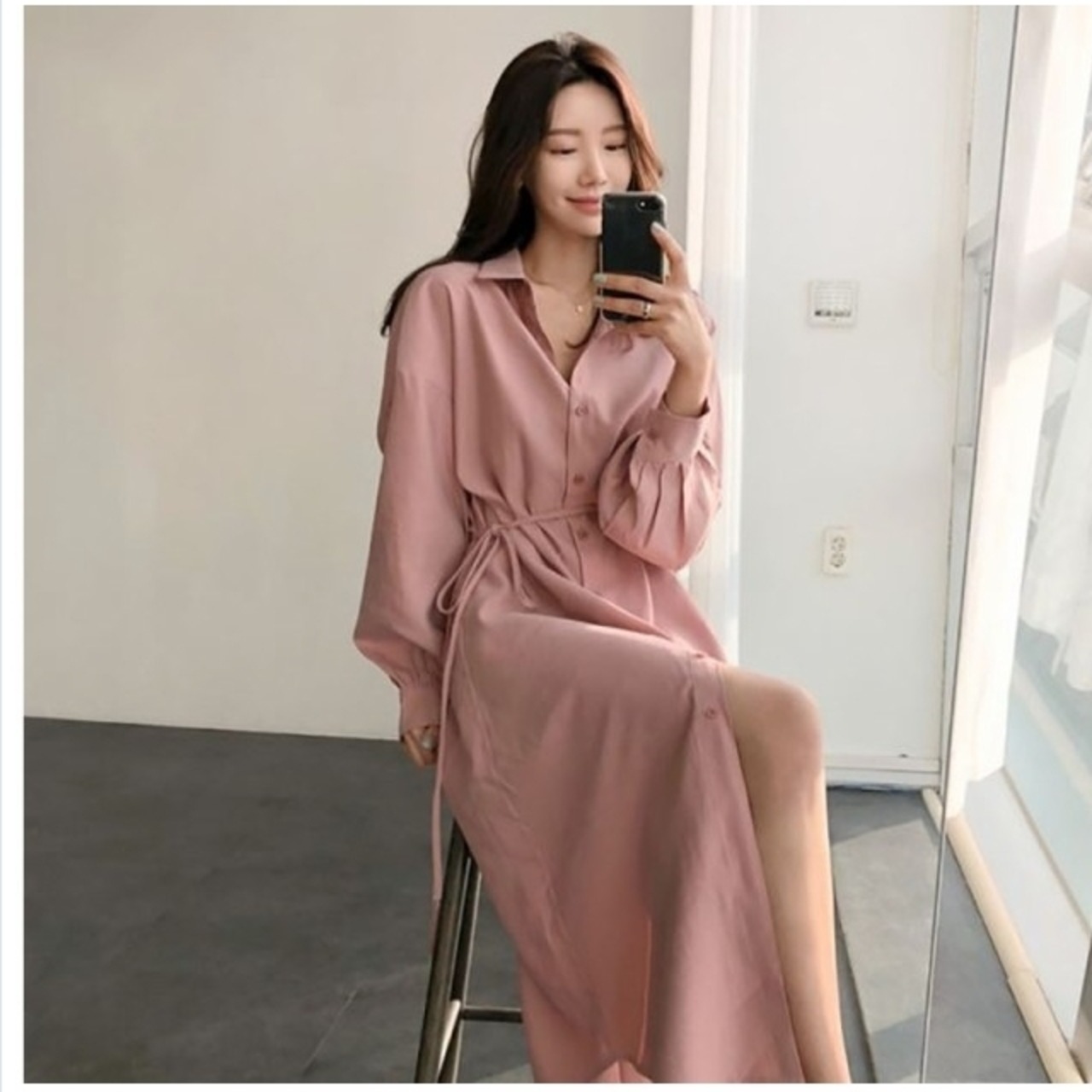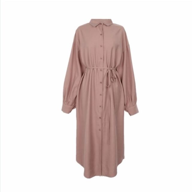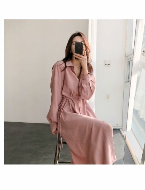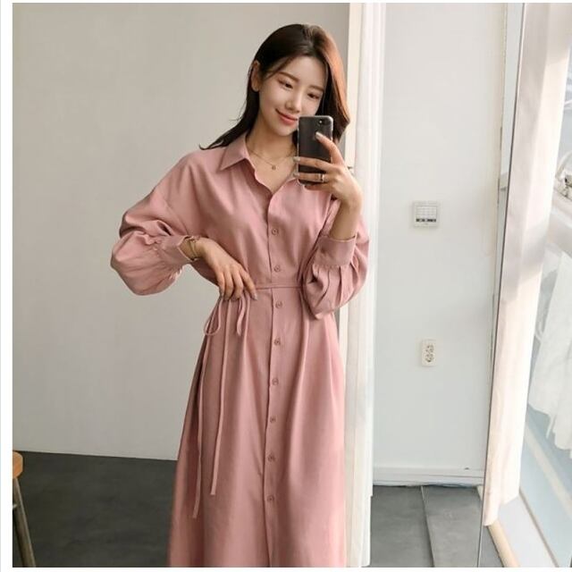 レトロ柄 ワンピース レディース かわいい ワンピース リボン 長袖 秋冬 シャツ おしゃれ ミモレ丈 前開き 無地 ピンク サイズ豊富