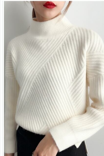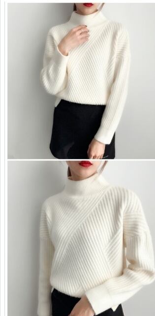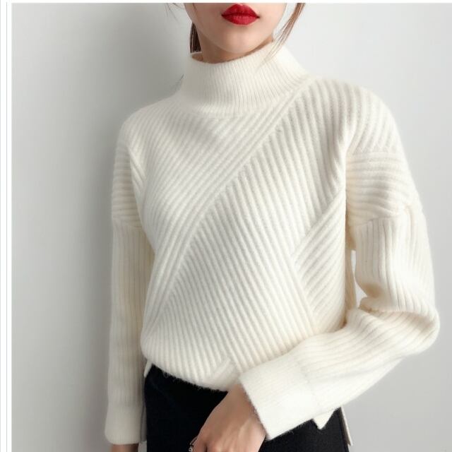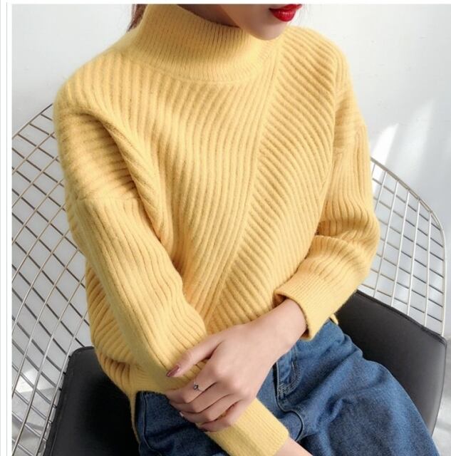 ゆるニット セーター レディース リブニット ストライプニット 厚手 無地ニット あったか 長袖 暖かい ゆるニット リブ編み ハイネック