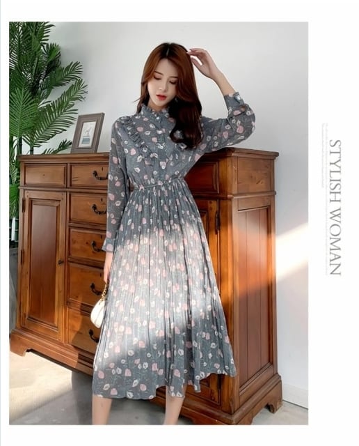 花柄 ロングワンピース 長袖 春 新作 花柄 シフォン ワンピース フレア 長袖 ハイウエスト ロング ライトピンク ブルーグレー 10代 20代