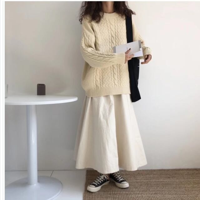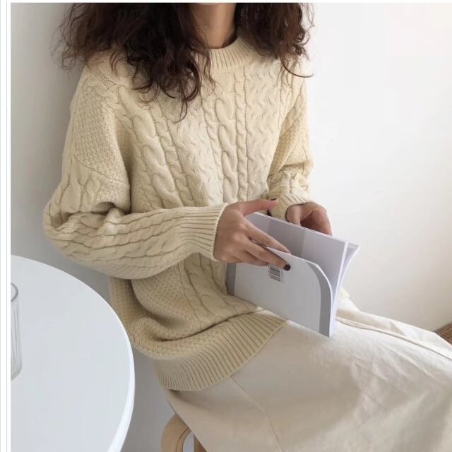 ゆるニット ニット セーター ケーブルニット トップス レディース バックシャン バルーン袖 無地 秋 冬 ミディアム丈 オフタートルネッ