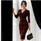 大人 ワンピース タイト 膝丈 チェック柄 ワンピースドレス Vネック 秋 タイトワンピース 30代 20代 春 二次会 膝丈ワンピース 大人 40代